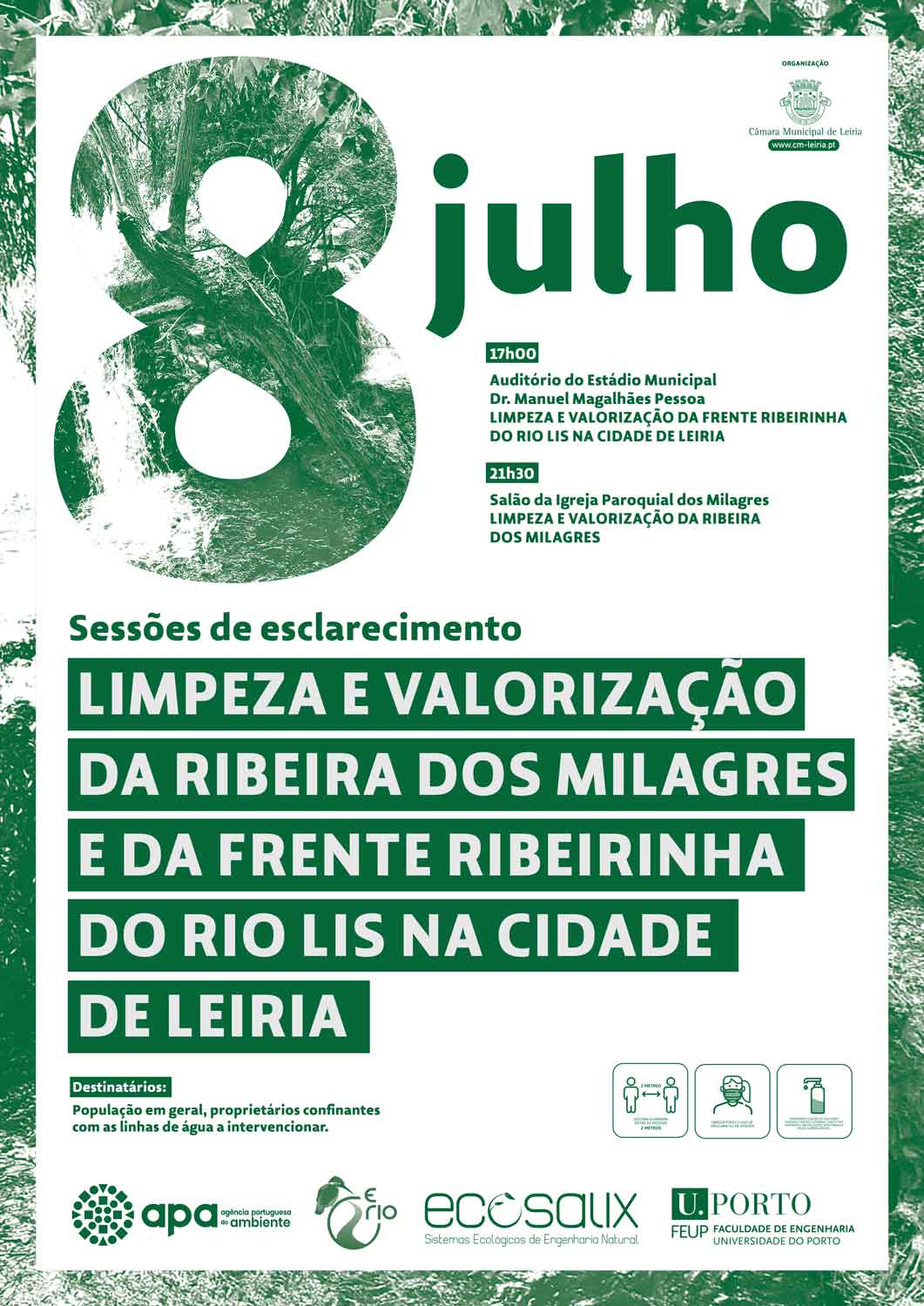 Sendo um dos objetivos do projeto de “Limpeza e Valorização da Ribeira dos Milagres e da Frente Ribeirinha do Rio Lis na Cidade De Leiria” envolver a população na requalificação e melhoria dessas linhas de água através das ações de limpeza e valorização das suas margens e do leito, o Município promove as duas sessões de esclarecimento com o objetivo de apresentação dos trabalhos e esclarecimento de dúvidas aos proprietários e população em geral.
