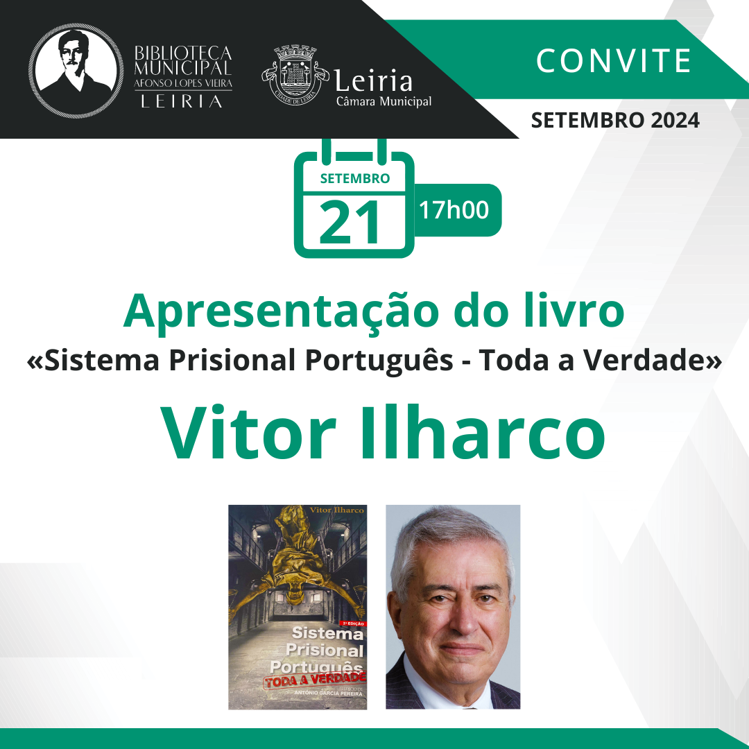 No próximo dia 21 de setembro de 2024, às 17h00, a Biblioteca Municipal Afonso Lopes Vieira, em Leiria, receberá o lançamento do aguardado livro de Vitor Ilharco, intitulado "Sistema Prisional Português - Toda a Verdade".
