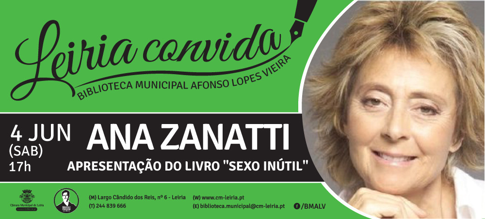 A escritora e atriz Ana Zanatti é a convidada para a próxima iniciativa “Leiria Convida”, dia 04 de junho, às 17:00, uma iniciativa da biblioteca municipal marcado por um ambiente de tertúlia e que oferece um “chá das cinco” servido pela Escola Profissional de Leiria.