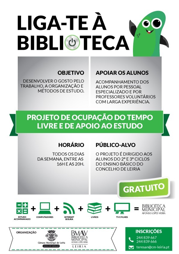 A Câmara Municipal de Leiria, através da Biblioteca Municipal Afonso Lopes Vieira, vai garantir gratuitamente apoio ao estudo, em horário extra-escolar, aos alunos do 2º e 3º ciclo do Ensino Básico, no sentido de promover o sucesso escolar.