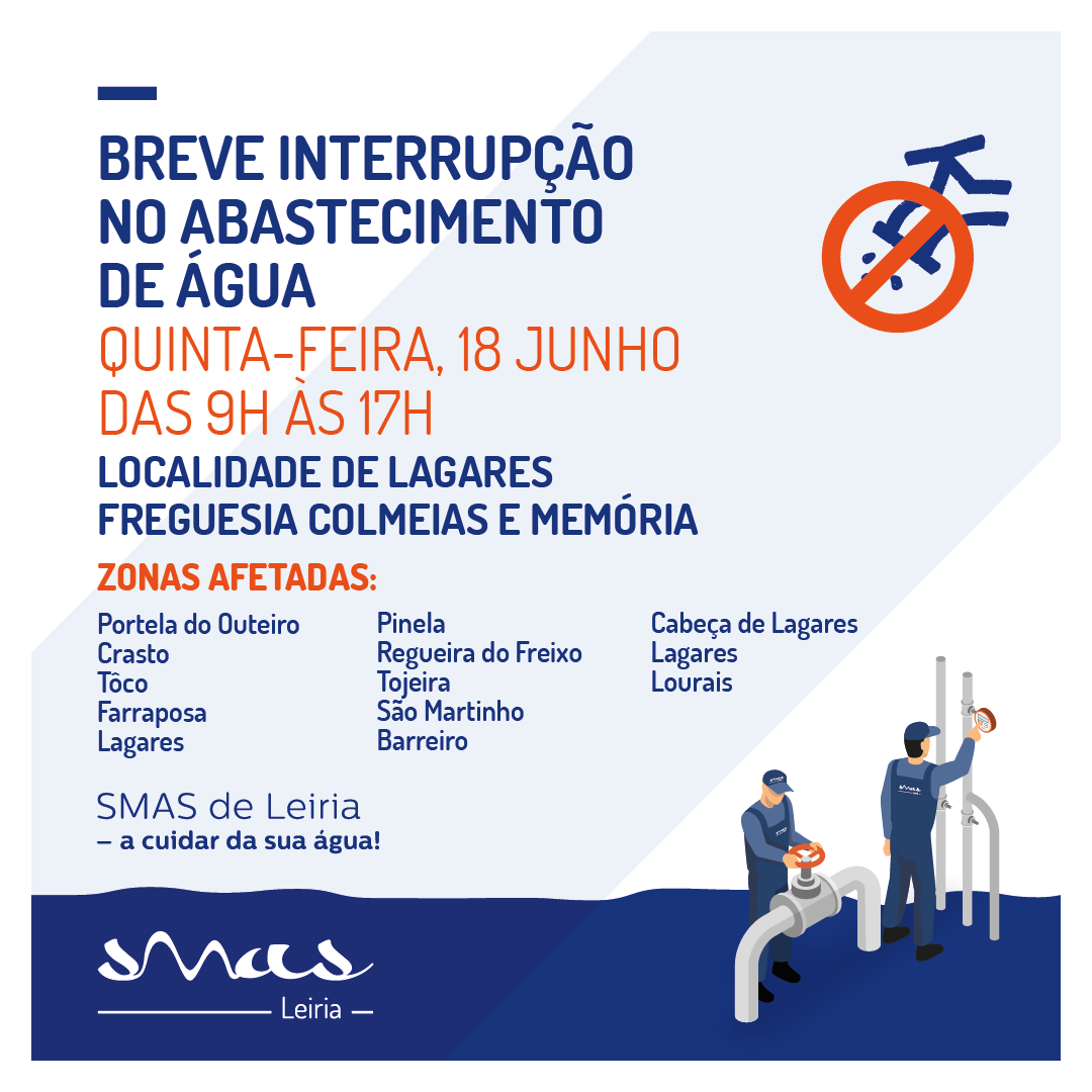 A Câmara Municipal e os SMAS de Leiria informam que na sequência das obras de Remodelação da Válvula Redutora de Pressão situada na localidade de Lagares, na Freguesia de Colmeias e Memória, irá ser realizada uma intervenção,no próximo dia 18 de junho, entre as 9:00 e as 17:00, que provocará constrangimentos no abastecimento de água.
