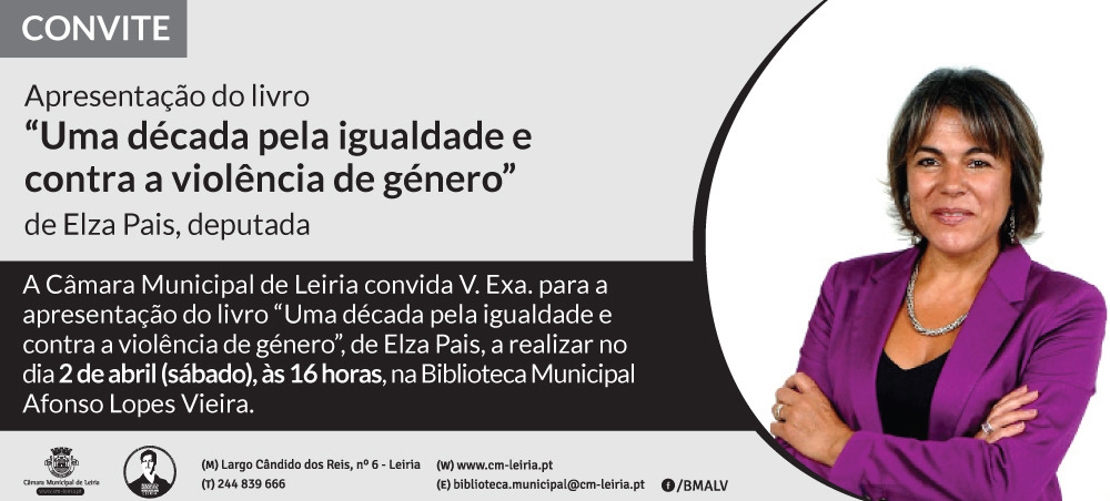 A Biblioteca Municipal de Leiria é palco no sábado, dia 2 de abril, às 16 horas, da apresentação do livro “Uma década pela igualdade e contra a violência de género”, da autoria da deputada da Assembleia da República, Elza Pais.