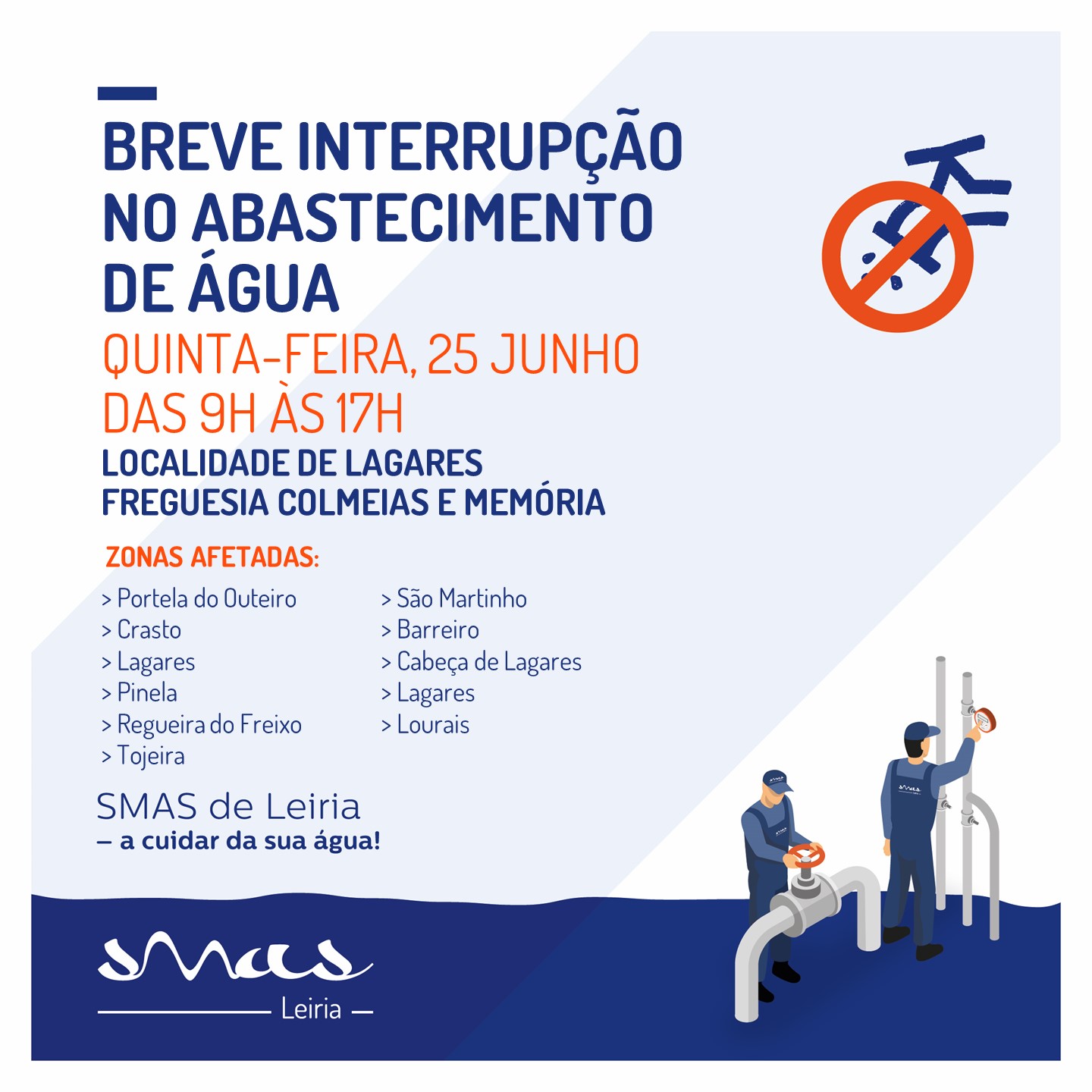 A Câmara Municipal e os SMAS de Leiria informam que na sequência das obras de Remodelação da Válvula Redutora de Pressão situada na localidade de Lagares, na Freguesia de Colmeias e Memória, terá lugar uma intervenção, que provocará constrangimentos no abastecimento de água.