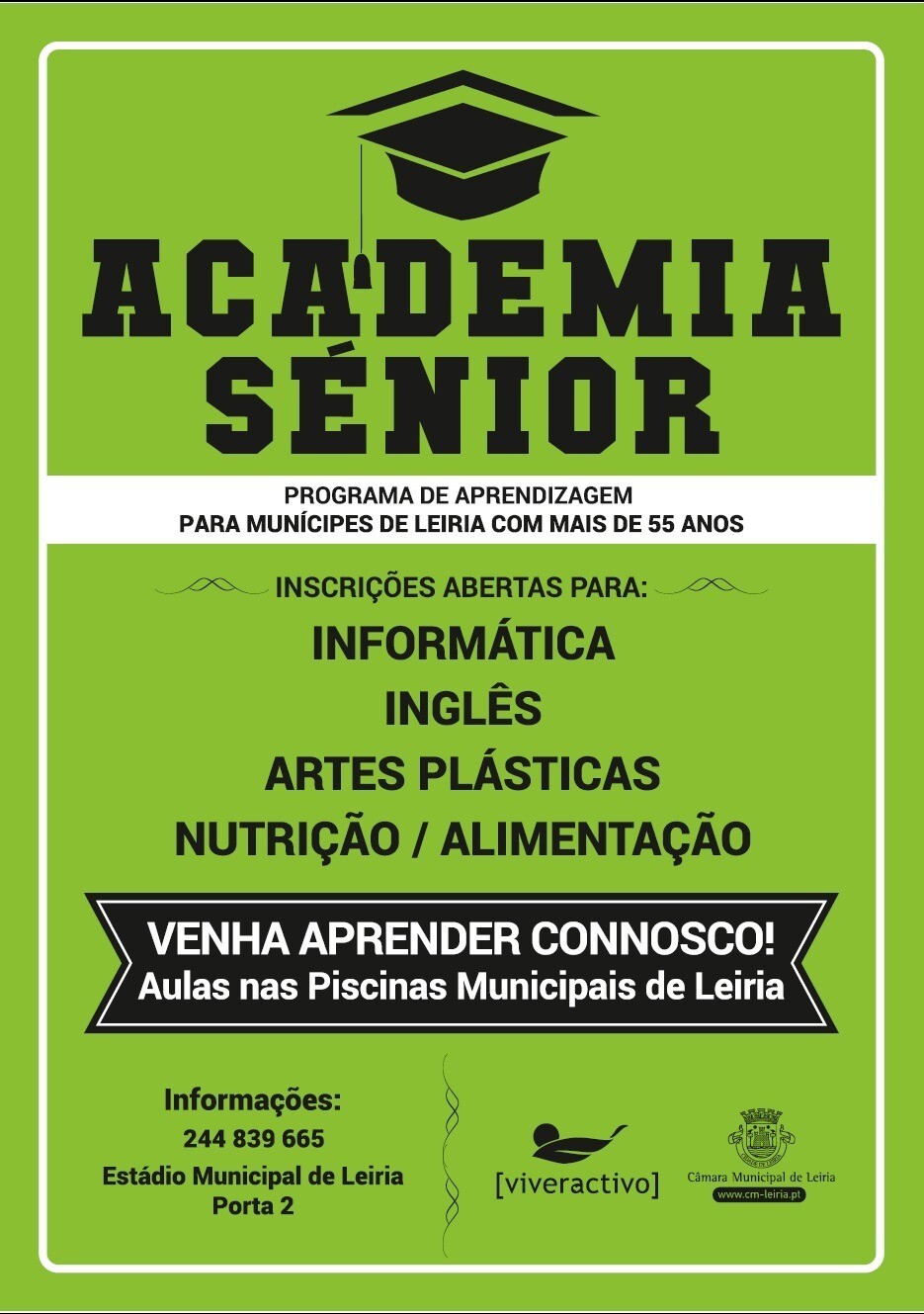 O Município de Leiria lançou no início deste mês a “Academia Sénior”, uma iniciativa com o objectivo de promover um envelhecimento ativo da população e concretizar uma política social integrada e participativa, estando abertas inscrições para aulas de inglês, informática, artes plásticas e nutrição e alimentação.