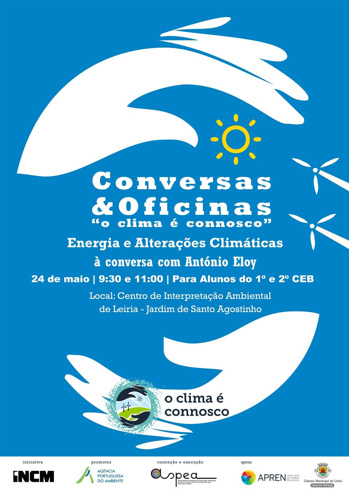 No dia 24 de maio, no Centro de Interpretação Ambiental de Leiria, realiza-se às 9:30 e às 11:00, a iniciativa Conversas e Oficinas - “O Clima é Connosco” sobre a temática das Energias e Alterações Climáticas, dirigida ao público escolar do 1º e 2º CEB.