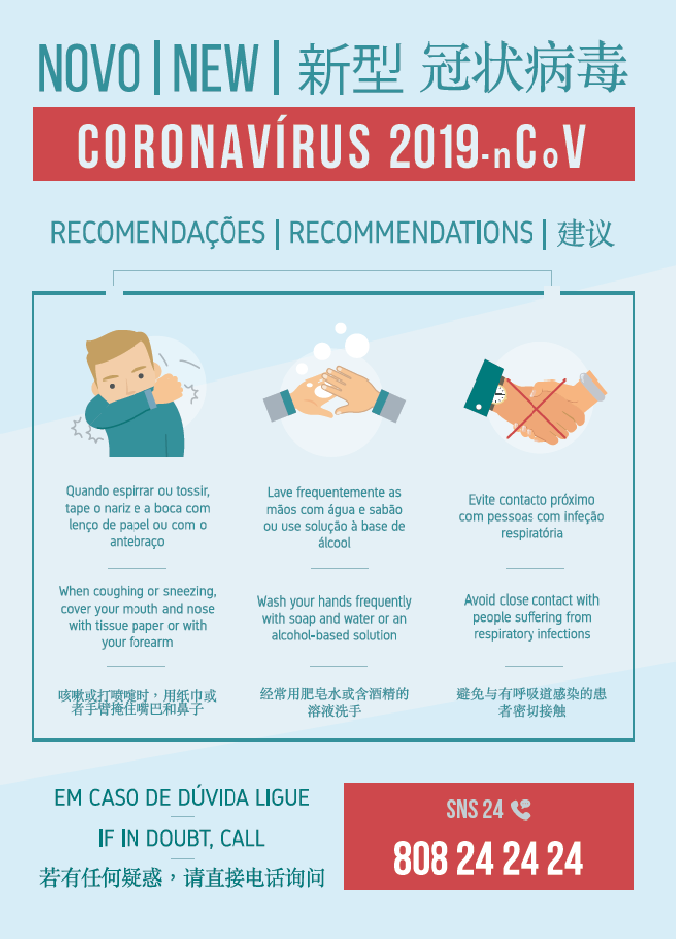 Informação da Direção Geral de Saúde (DGS) com recomendações gerais relativas ao novo Coronavírus.